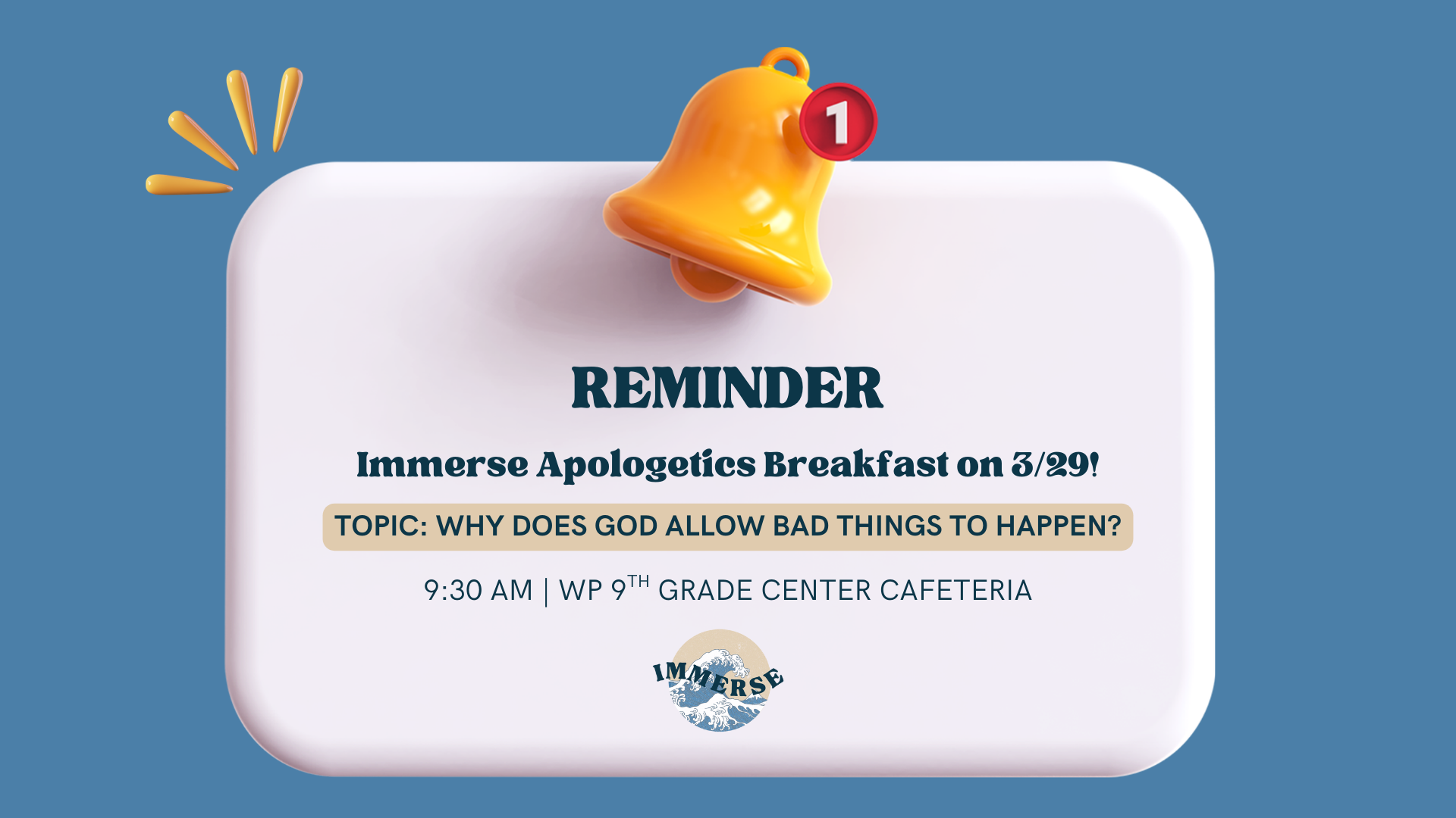 Why does God allow bad things to happen? This is a frequent question that Christians and non-Christians alike ask, and can be a major barrier to people who are considering the faith. Immerse students, we hope that you'll join us for our Apologetics Breakfast on 3/29 to learn more about the nuances of this question and how to respond when people ask it.